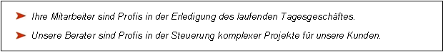 Damit reduzieren wir das Risiko eines kostenintensiven Fehlschlages und sorgen für eine umfassende Projektplanung und Projektsteuerung, mit der alle definierten Projektziele natürlich on Time und in Budget erreicht werden.